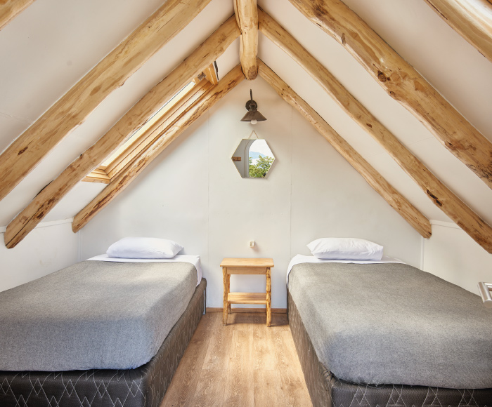 The cabin offers a room for 2-3 people, with fully-made beds and towels, and shared bathrooms with hot water.